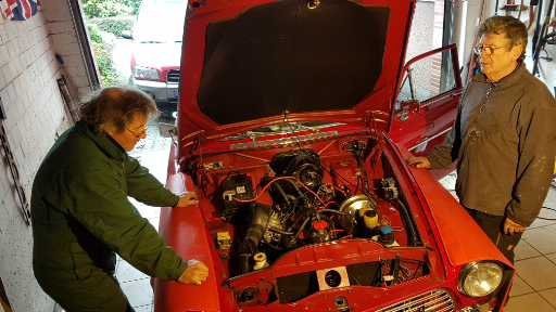 Ein paar Tage später stand das bewährte Team wieder bereit, um den „Möti“ (Zitat Thomas) wieder einzubauen. Schon am ersten Samstagabend lief der Motor wieder, und nach dem zweiten Samstag war die Operation am Offenen Herzen beendet. Da auch das Getriebe ausgebaut war, wurde gleich auch eine neue Kupplung montiert, und der Vergaser wurde auch erneuert, der alte war ja auch immerhin schon 47 Jahre alt.
